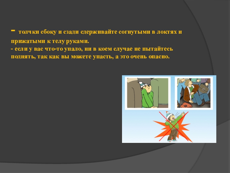 оказались в толпе, не идите против ее движения, придерживайтесь общей скорости движения. - старайтесь избегать центра толпы и ее края, уклоняйтесь от всего неподвижного в пути следования (столбов, тумб, деревьев), чтобы не быть прижатым к таким предметам. - не цепляйтесь ни за что руками, вам все равно не хватит сил сдержать напор толпы.