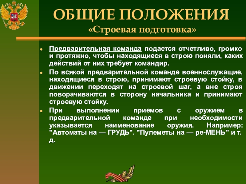 Предварительная команда подается отчетливо, громко и протяжно, чтобы