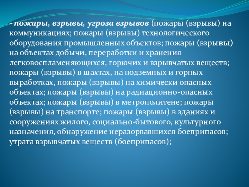 технологического оборудования промышленных объектов; пожары (взрывы) на объектах добычи, переработки и хранения легковоспламеняющихся, горючих и взрывчатых веществ; пожары (взрывы) в шахтах, на подземных и горных выработках, пожары (взрывы) на химически опасных объектах; пожары (взрывы) на радиационно-опасных объектах; пожары (взрывы) в метрополитене; пожары (взрывы) на транспорте; пожары (взрывы) в зданиях и сооружениях жилого, социально-бытового, культурного назначения, обнаружение неразорвавшихся боеприпасов; утрата взрывчатых веществ (боеприпасов);