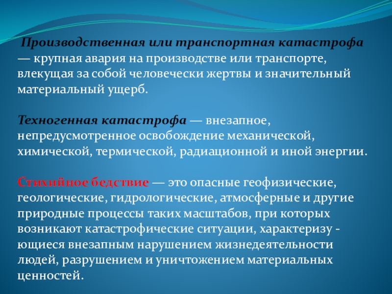 Стихийное бедствие — это опасные геофизические, геологические, гидрологические, атмосферные и другие природные процессы таких масштабов, при которых возникают катастрофические ситуации, характеризу -ющиеся внезапным нарушением жизнедеятельности людей, разрушением и уничтожением материальных ценностей.