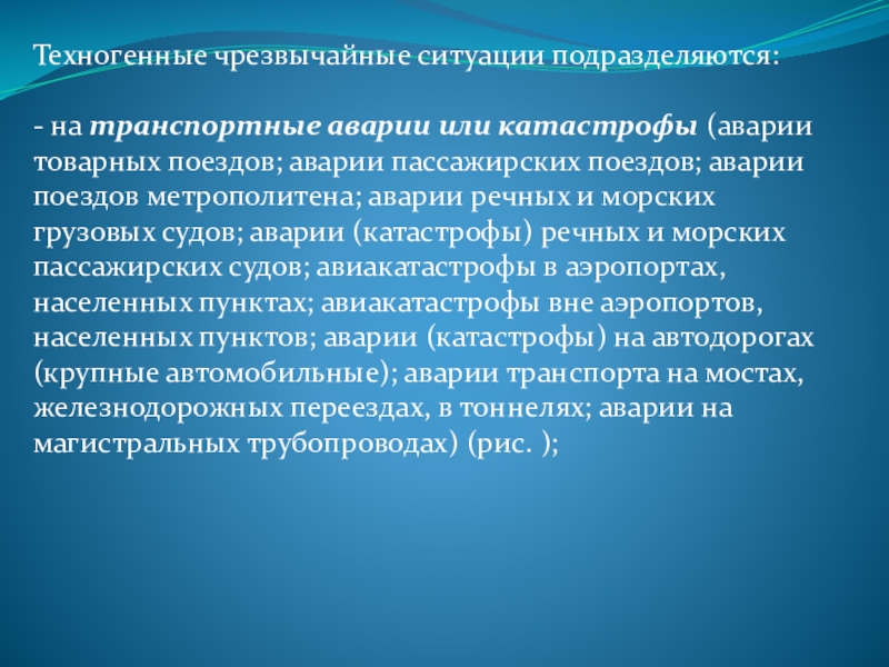 поездов; аварии пассажирских поездов; аварии поездов метрополитена; аварии речных и морских грузовых судов; аварии (катастрофы) речных и морских пассажирских судов; авиакатастрофы в аэропортах, населенных пунктах; авиакатастрофы вне аэропортов, населенных пунктов; аварии (катастрофы) на автодорогах (крупные автомобильные); аварии транспорта на мостах, железнодорожных переездах, в тоннелях; аварии на магистральных трубопроводах) (рис. );