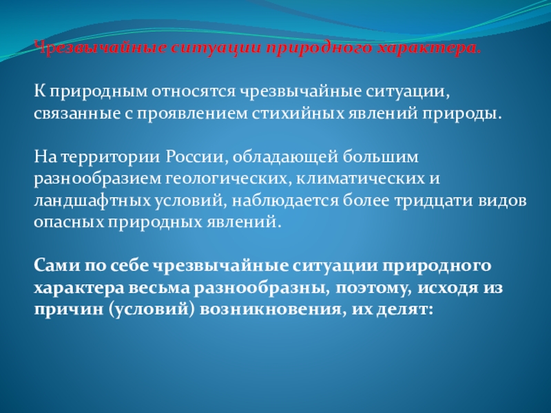 Сами по себе чрезвычайные ситуации природного характера весьма разнообразны, поэтому, исходя из причин (условий) возникновения, их делят: