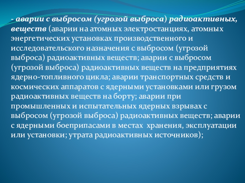 электростанциях, атомных энергетических установках производственного и исследовательского назначения с выбросом (угрозой выброса) радиоактивных веществ; аварии с выбросом (угрозой выброса) радиоактивных веществ на предприятиях ядерно-топливного цикла; аварии транспортных средств и космических аппаратов с ядерными установками или грузом радиоактивных веществ на борту; аварии при промышленных и испытательных ядерных взрывах с выбросом (угрозой выброса) радиоактивных веществ; аварии с ядерными боеприпасами в местах хранения, эксплуатации или установки; утрата радиоактивных источников);