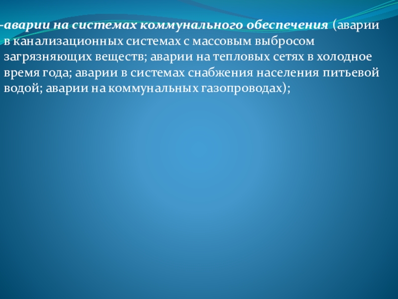 выбросом загрязняющих веществ; аварии на тепловых сетях в холодное время года; аварии в системах снабжения населения питьевой водой; аварии на коммунальных газопроводах);