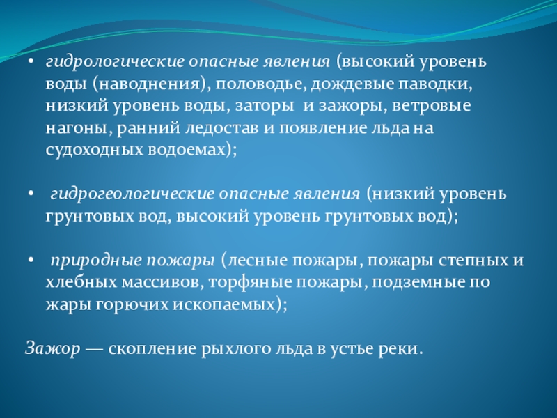 Слайд 12гидрологические опасные явления (высокий уровень воды (наводнения), половодье, дождевые паводки, низкий