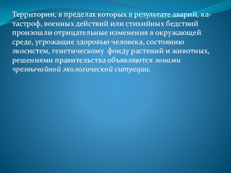 или стихийных бедствий произошли отрицательные изменения в окружающей среде, угрожащие здоровью человека, состоянию экосистем, генетическому фонду растений и животных, решениями правительства объявляются зонами чрезвычайной экологической ситуации.