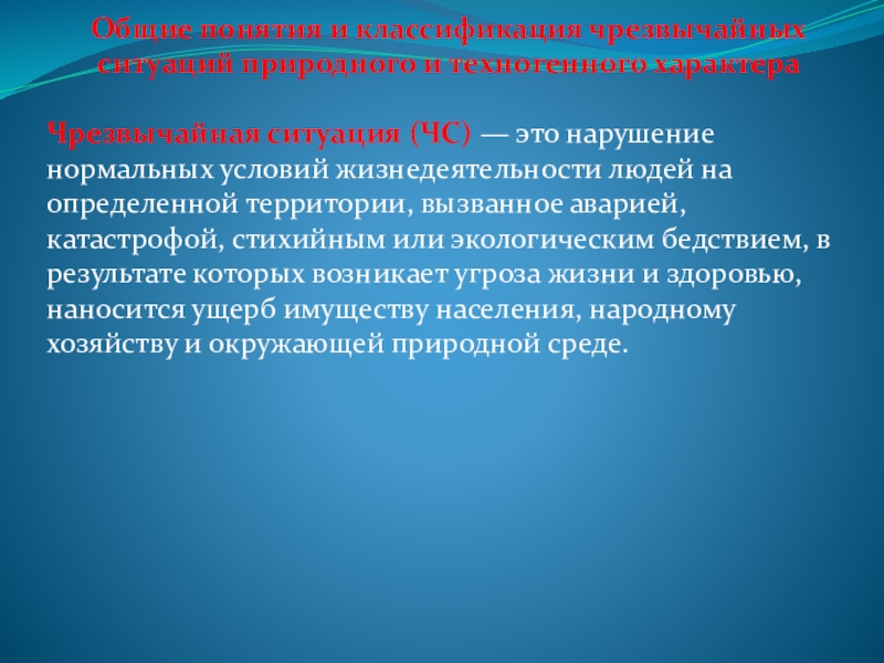 (ЧС) — это нарушение нормальных условий жизнедеятельности людей на определенной территории, вызванное аварией, катастрофой, стихийным или экологическим бедствием, в результате которых возникает угроза жизни и здоровью, наносится ущерб имуществу населения, народному хозяйству и окружающей природной среде.