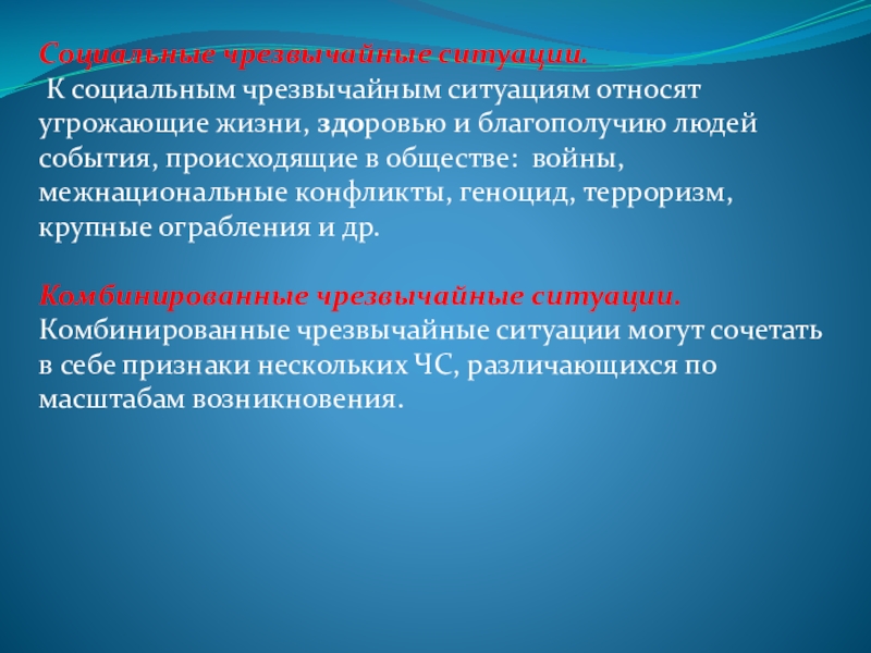 К социальным чрезвычайным ситуациям относят угрожающие жизни, здоровью