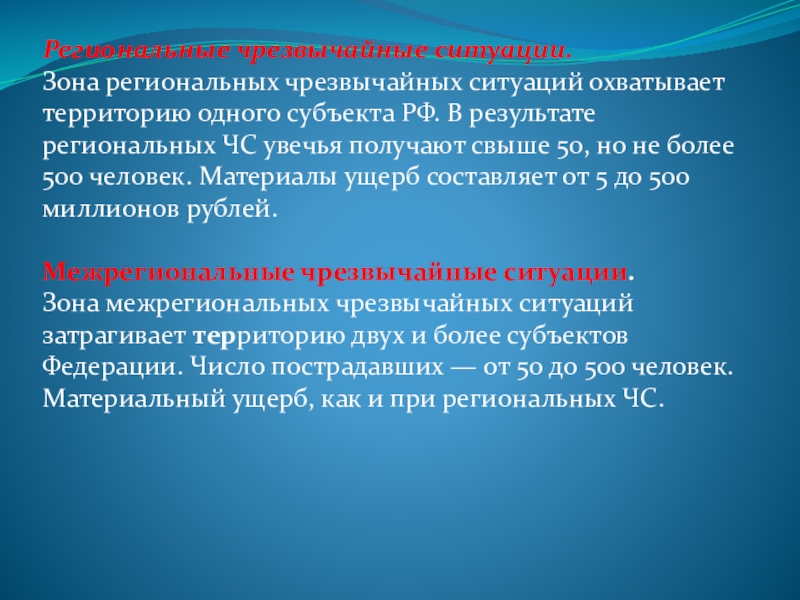 РФ. В результате региональных ЧС увечья получают свыше 50, но не более 500 человек. Материалы ущерб составляет от 5 до 500 миллионов рублей.