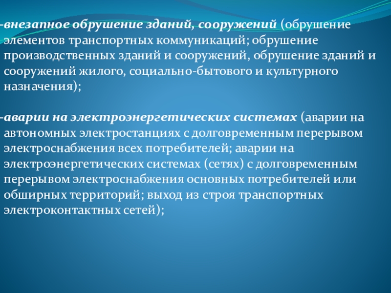 аварии на электроэнергетических системах (аварии на автономных электростанциях с долговременным перерывом электроснабжения всех потребителей; аварии на электроэнергетических системах (сетях) с долговременным перерывом электроснабжения основных потребителей или обширных территорий; выход из строя транспортных электроконтактных сетей);