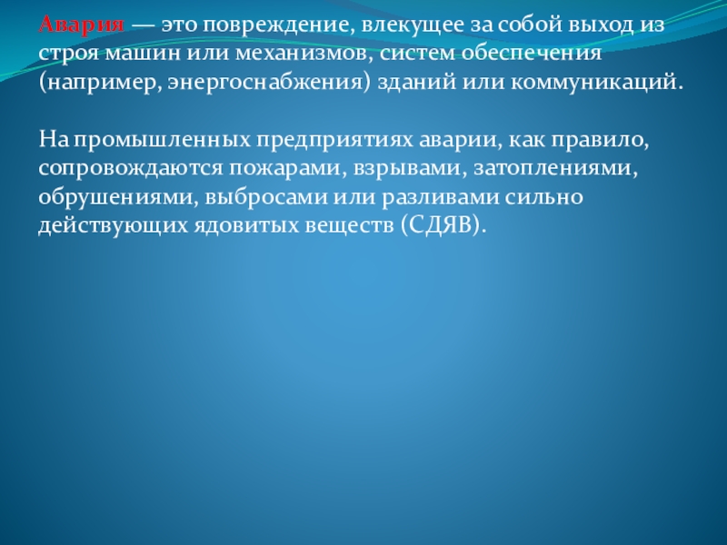 На промышленных предприятиях аварии, как правило, сопровождаются пожарами, взрывами, затоплениями, обрушениями, выбросами или разливами сильно действующих ядовитых веществ (СДЯВ).