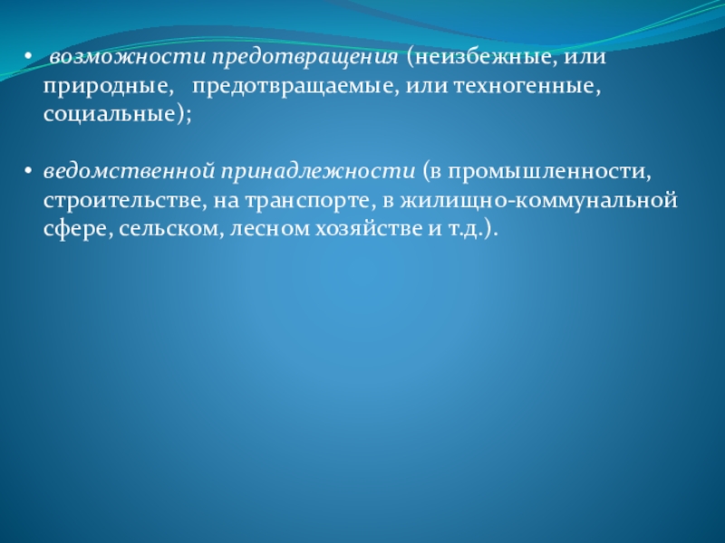 возможности предотвращения (неизбежные, или природные, предотвращаемые, или техногенные, социальные);