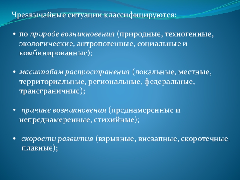 по природе возникновения (природные, техногенные, экологические, антропогенные, социальные и