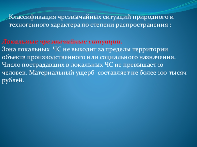 Зона локальных ЧС не выходит за пределы территории объекта производственного или социального назначения. Число пострадавших в локальных ЧС не превышает 10 человек. Материальный ущерб составляет не более 100 тысяч рублей.