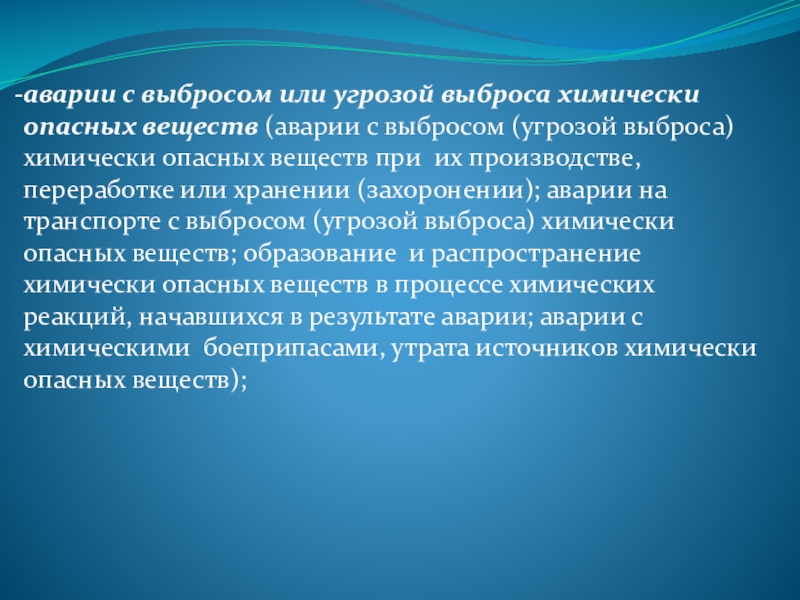 выбросом (угрозой выброса) химически опасных веществ при их производстве, переработке или хранении (захоронении); аварии на транспорте с выбросом (угрозой выброса) химически опасных веществ; образование и распространение химически опасных веществ в процессе химических реакций, нaчавшихся в результате аварии; аварии с химическими боеприпасами, утрата источников химически опасных веществ);