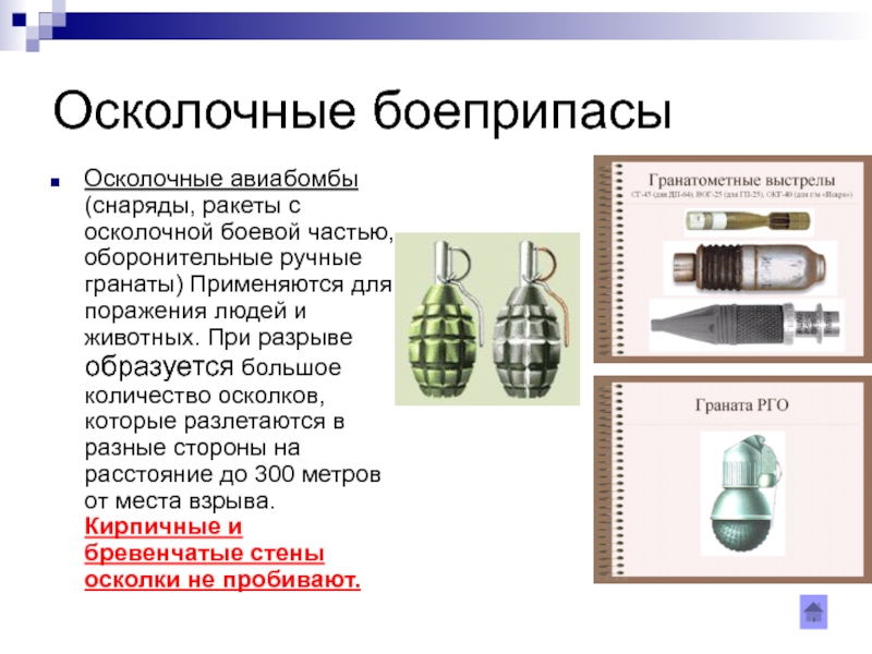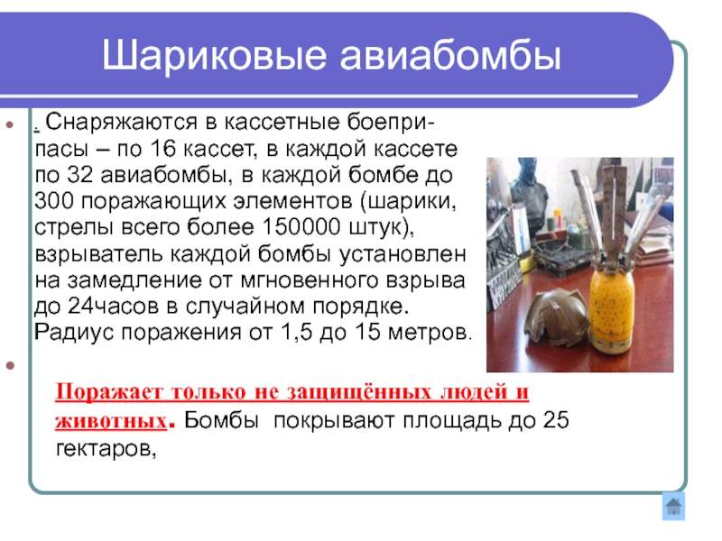 Поражает только не защищённых людей и животных. Бомбы покрывают площадь до 25 гектаров,