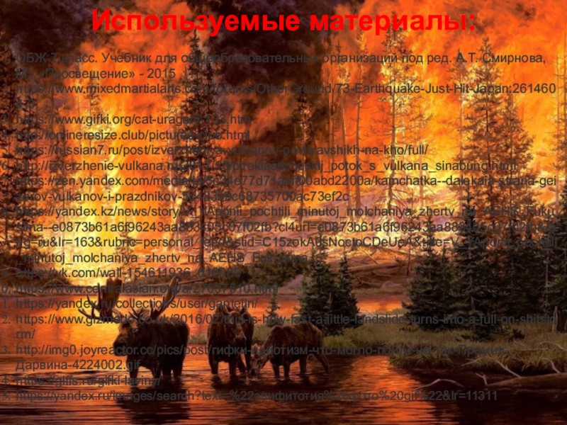 Используемые материалы:ОБЖ 7 класс. Учебник для общеобразовательных организаций под ред. А.Т. Смирнова, М.: «Просвещение» - 2015 https://www.mixedmartialarts.com/forums/OtherGround/73-Earthquake-Just-Hit-Japan:2614604-3https://www.gifki.org/cat-uragani-133.htmhttp://onlineresize.club/pictures-club.htmlhttps://russian7.ru/post/izverzheniya-vulkanov-povliyavshikh-na-kho/full/http://izverzhenie-vulkana.ru/2017/10/piroklasticheskij_potok_s_vulkana_sinabung.htmlhttps://zen.yandex.com/media/id/5c34e77d71a4ff00abd2200a/kamchatka--dalekaia-strana-geizerov-vulkanov-i-prazdnikov-5c433b9c68735700ac73ef2chttps://yandex.kz/news/story/V_YAponii_pochtili_minutoj_molchaniya_zhertv_na_AEHS_Fukusima--e0873b61a6f96243aa883405c07f02fb?cl4url=e0873b61a6f96243aa883405c07f02fb&lang=ru&lr=163&rubric=personal_feed&stid=C15zokA0sNoctoCDeUeA&title=V_YAponii_pochtili_minutoj_molchaniya_zhertv_na_AEHS_Fukusimahttps://vk.com/wall-154611936_610080https://www.centralasian.org/a/27607510.htmlhttps://yandex.ru/collections/user/gantelin/https://www.gizmodo.co.uk/2016/02/this-is-how-fast-a-little-landslide-turns-into-a-full-on-shitstorm/http://img0.joyreactor.cc/pics/post/гифки-идиотизм-что-могло-пойти-не-так-Премия-Дарвина-4224002.gifhttps://giffs.ru/gifki-laviny/https://yandex.ru/images/search?text=%22эпифитотия%20фото%20gif%22&lr=11311