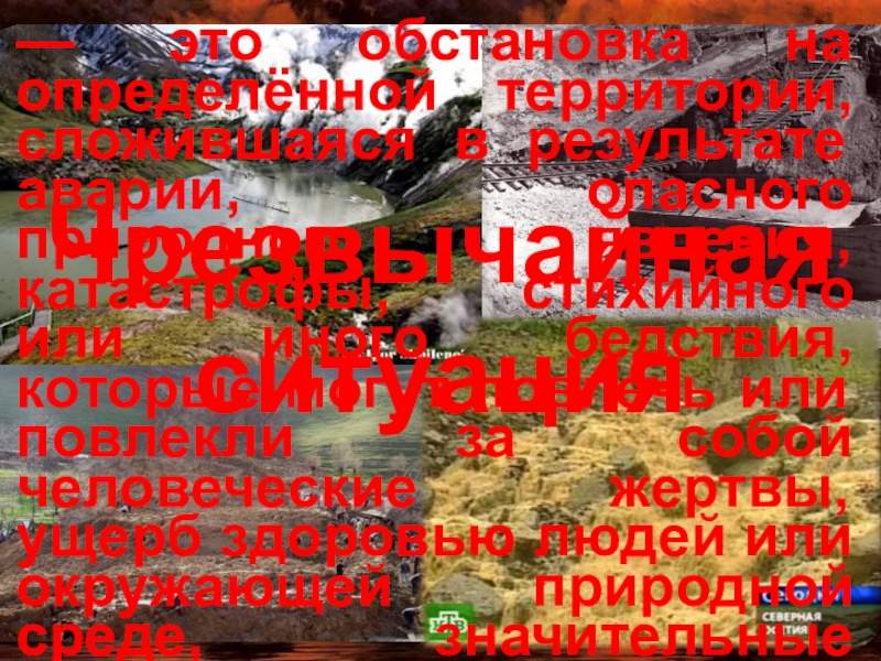 Чрезвычайная ситуация— это обстановка на определённой территории, сложившаяся в результате аварии, опасного природного явления, катастрофы, стихийного или