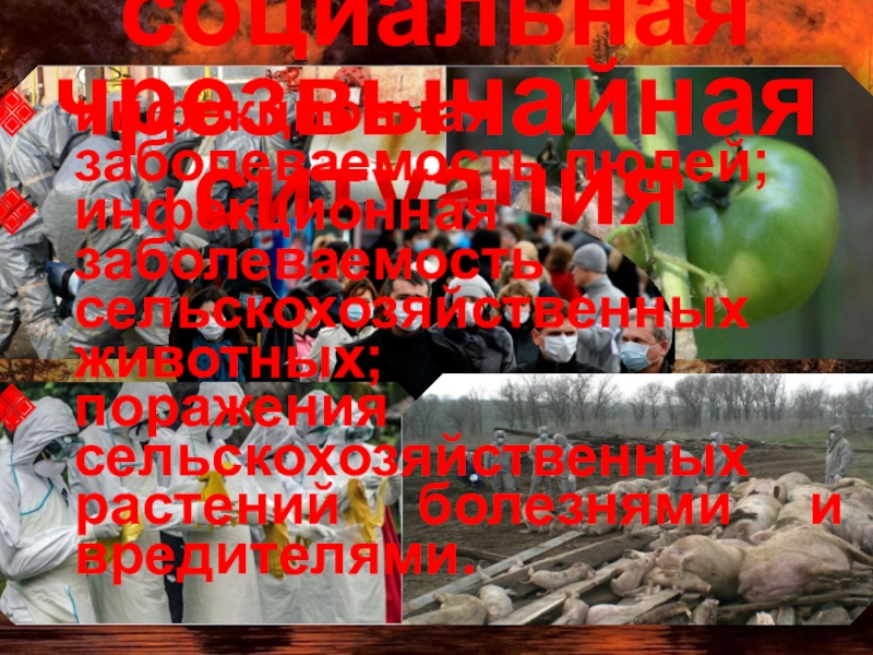 Биолого-социальная чрезвычайная ситуацияинфекционная заболеваемость людей;инфекционная заболеваемость сельскохозяйственных животных;поражения сельскохозяйственных растений болезнями и вредителями.