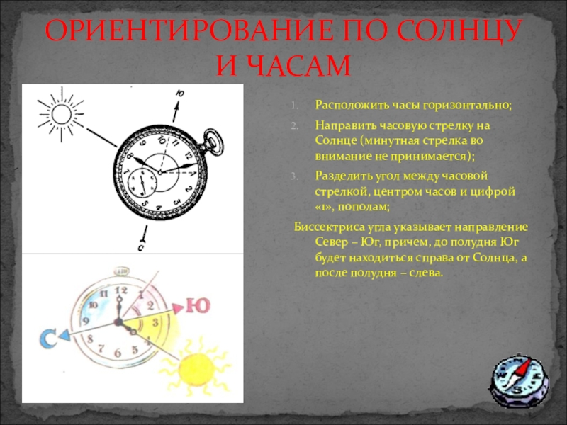 Слайд 7ОРИЕНТИРОВАНИЕ ПО СОЛНЦУ И ЧАСАМ