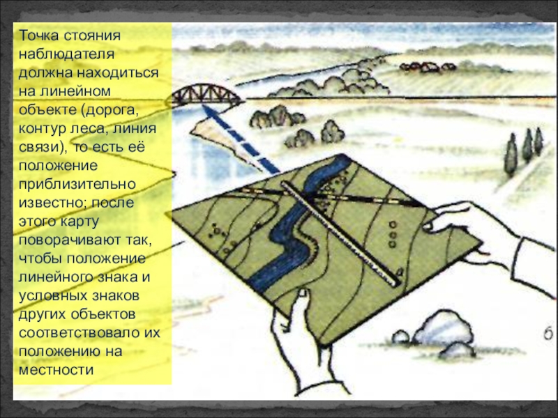 Слайд 20Точка стояния наблюдателя должна находиться на линейном объекте (дорога, контур леса,