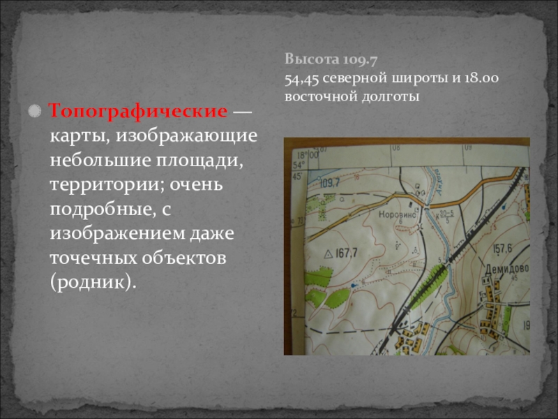 Высота 109.7 54,45 северной широты и 18.00 восточной долготыТопографические — карты, изображающие небольшие площади, территории; очень подробные,