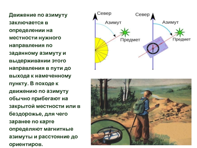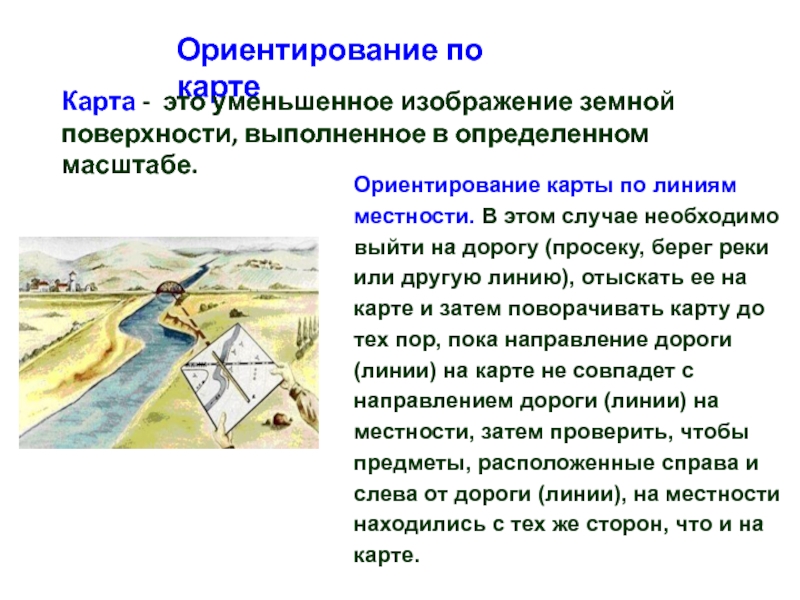Ориентирование карты по линиям местности. В этом случае необходимо выйти на дорогу (просеку, берег реки или другую линию), отыскать ее на карте и затем поворачивать карту до тех пор, пока направление дороги (линии) на карте не совпадет с направлением дороги (линии) на местности, затем проверить, чтобы предметы, расположенные справа и слева от дороги (линии), на местности находились с тех же сторон, что и на карте.