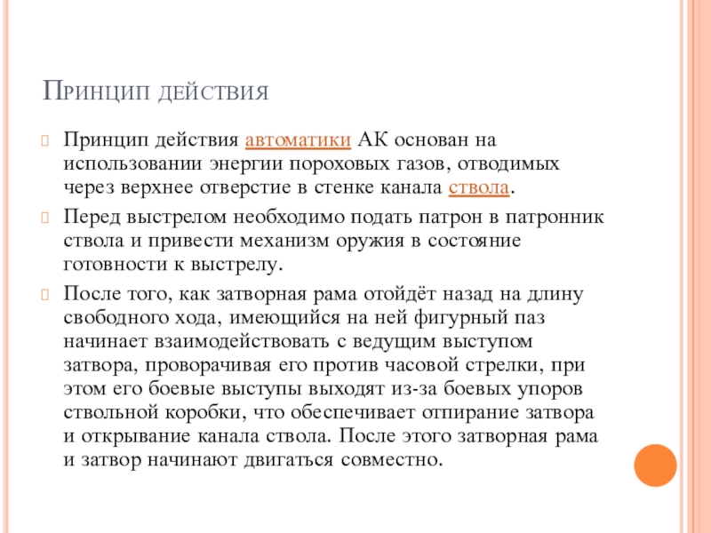 Принцип действия автоматики АК основан на использовании энергии пороховых газов,