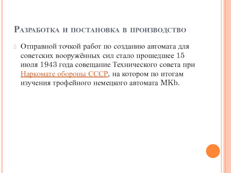 советских вооружённых сил стало прошедшее 15 июля 1943 года совещание Технического совета при Наркомате обороны СССР, на котором по итогам изучения трофейного немецкого автомата MKb.
