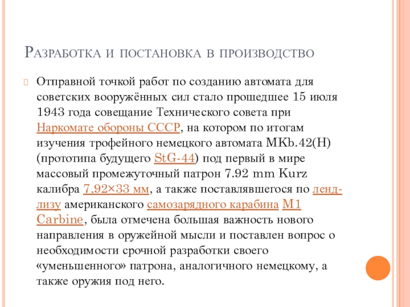 советских вооружённых сил стало прошедшее 15 июля 1943 года совещание Технического совета при Наркомате обороны СССР, на котором по итогам изучения трофейного немецкого автомата MKb.42(H) (прототипа будущего StG-44) под первый в мире массовый промежуточный патрон 7.92 mm Kurz калибра 7,92×33 мм, а также поставлявшегося по ленд-лизу американского самозарядного карабина M1 Carbine, была отмечена большая важность нового направления в оружейной мысли и поставлен вопрос о необходимости срочной разработки своего «уменьшенного» патрона, аналогичного немецкому, а также оружия под него.