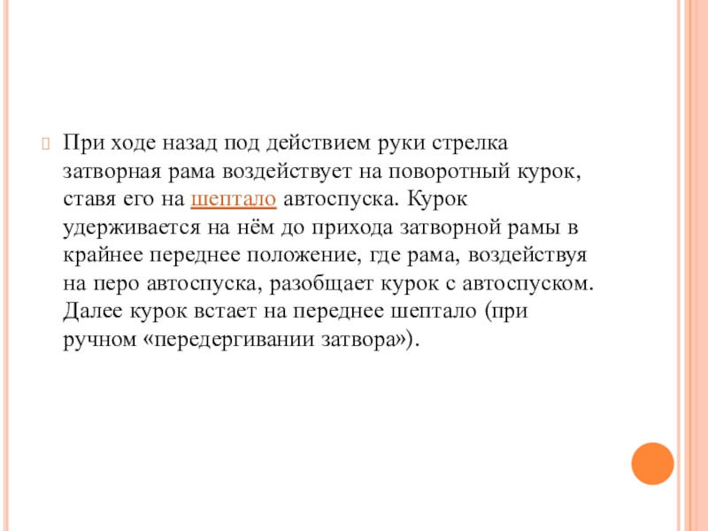 Слайд 20При ходе назад под действием руки стрелка затворная рама воздействует на