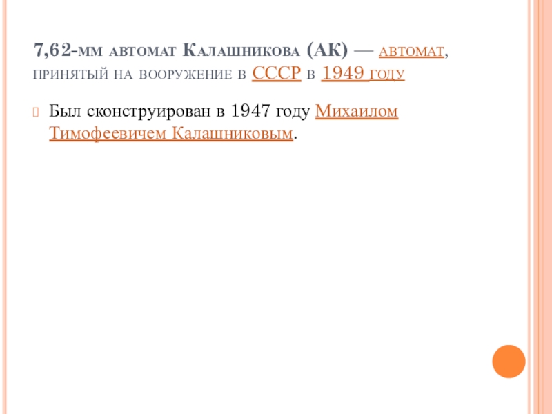 Слайд 27,62-мм автомат Калашникова (АК) — автомат, принятый на вооружение в СССР в