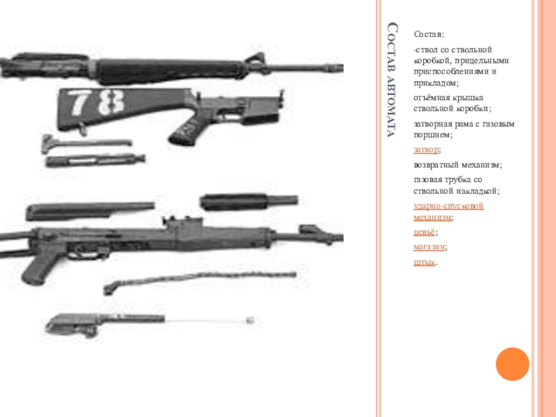 Состоит в основном из затворной рамы с газовым поршнем, непосредственно