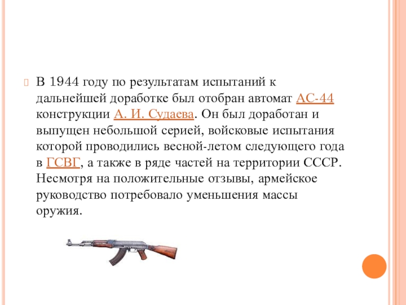 автомат АС-44 конструкции А. И. Судаева. Он был доработан и выпущен небольшой серией, войсковые испытания которой проводились весной-летом следующего года в ГСВГ, а также в ряде частей на территории СССР. Несмотря на положительные отзывы, армейское руководство потребовало уменьшения массы оружия.