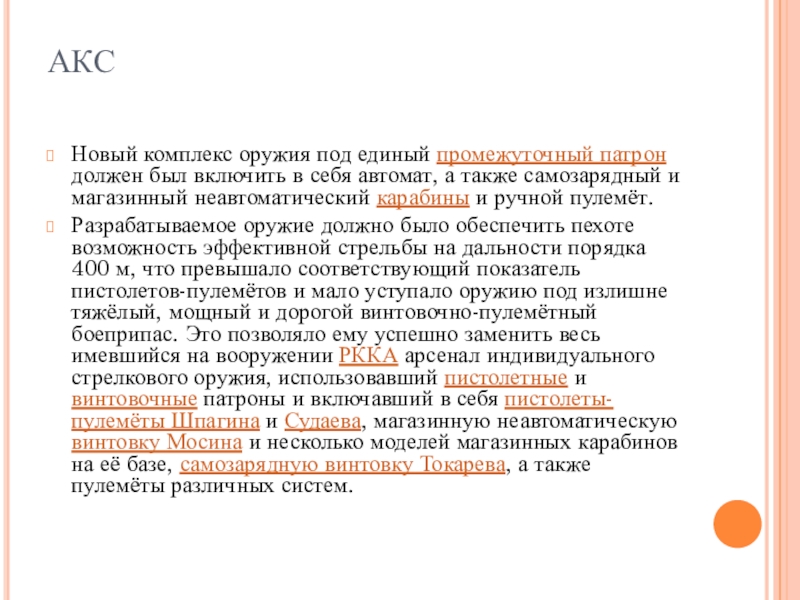 Разрабатываемое оружие должно было обеспечить пехоте возможность эффективной стрельбы на дальности порядка 400 м, что превышало соответствующий показатель пистолетов-пулемётов и мало уступало оружию под излишне тяжёлый, мощный и дорогой винтовочно-пулемётный боеприпас. Это позволяло ему успешно заменить весь имевшийся на вооружении РККА арсенал индивидуального стрелкового оружия, использовавший пистолетные и винтовочные патроны и включавший в себя пистолеты-пулемёты Шпагина и Судаева, магазинную неавтоматическую винтовку Мосина и несколько моделей магазинных карабинов на её базе, самозарядную винтовку Токарева, а также пулемёты различных систем.