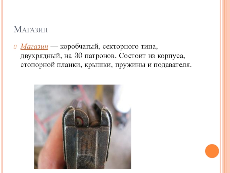 Магазин — коробчатый, секторного типа, двухрядный, на 30 патронов. Состоит из корпуса,