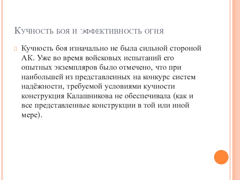АК. Уже во время войсковых испытаний его опытных экземпляров было отмечено, что при наибольшей из представленных на конкурс систем надёжности, требуемой условиями кучности конструкция Калашникова не обеспечивала (как и все представленные конструкции в той или иной мере).