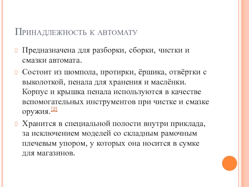 шомпола, протирки, ёршика, отвёртки с выколоткой, пенала для хранения и маслёнки. Корпус и крышка пенала используются в качестве вспомогательных инструментов при чистке и смазке оружия.[2]