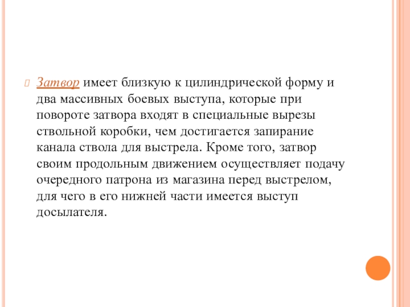 Слайд 13Затвор имеет близкую к цилиндрической форму и два массивных боевых выступа,