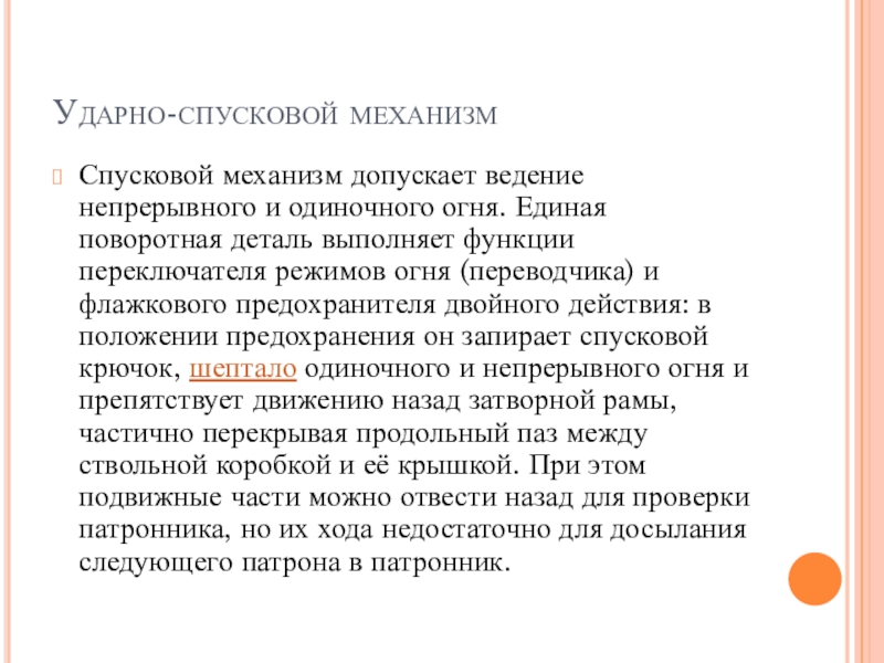поворотный курок, ставя его на шептало автоспуска. Курок удерживается на нём до прихода затворной рамы в крайнее переднее положение, где рама, воздействуя на перо автоспуска, разобщает курок с автоспуском. Далее курок встает на переднее шептало (при ручном «передергивании затвора»).