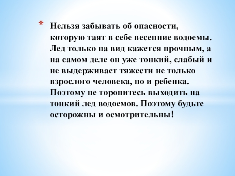только на вид кажется прочным, а на самом деле он уже тонкий, слабый и не выдерживает тяжести не только взрослого человека, но и ребенка. Поэтому не торопитесь выходить на тонкий лед водоемов. Поэтому будьте осторожны и осмотрительны!