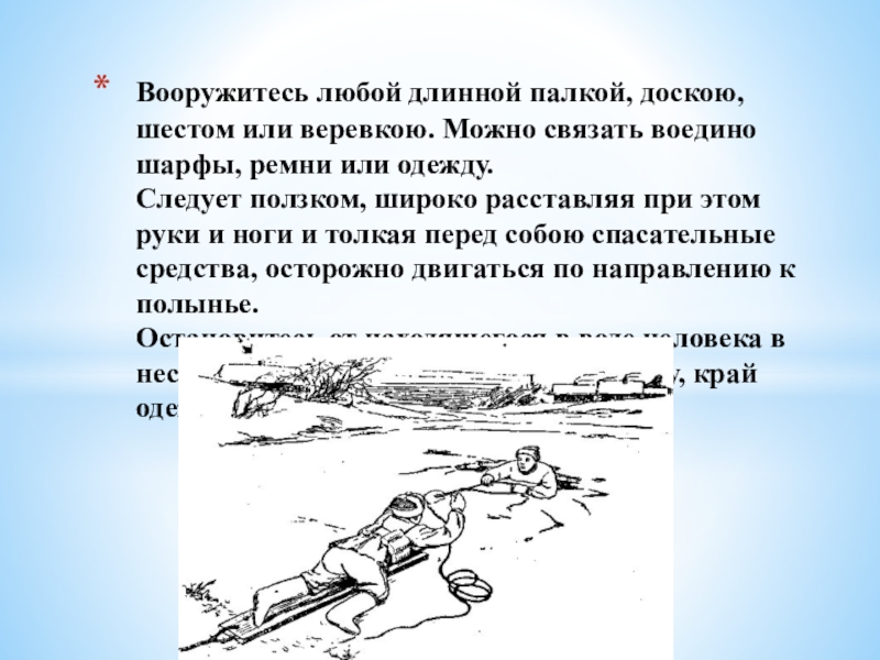 Следует ползком, широко расставляя при этом руки и ноги и толкая перед собою спасательные средства, осторожно двигаться по направлению к полынье.
