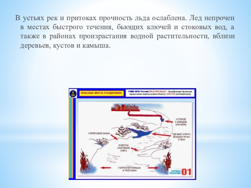 Слайд 7В устьях рек и притоках прочность льда ослаблена. Лед непрочен в