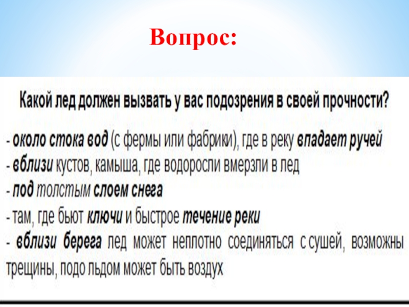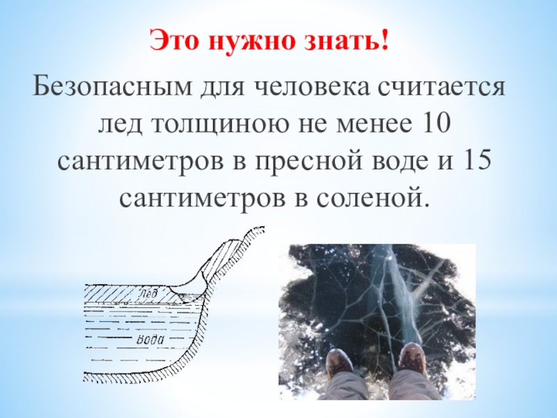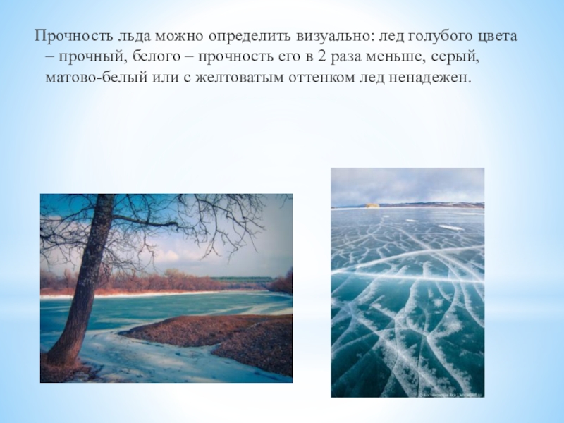 Слайд 10Прочность льда можно определить визуально: лед голубого цвета – прочный, белого