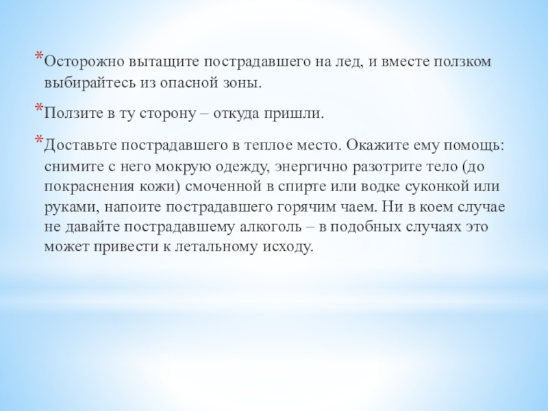 Осторожно вытащите пострадавшего на лед, и вместе ползком выбирайтесь из опасной