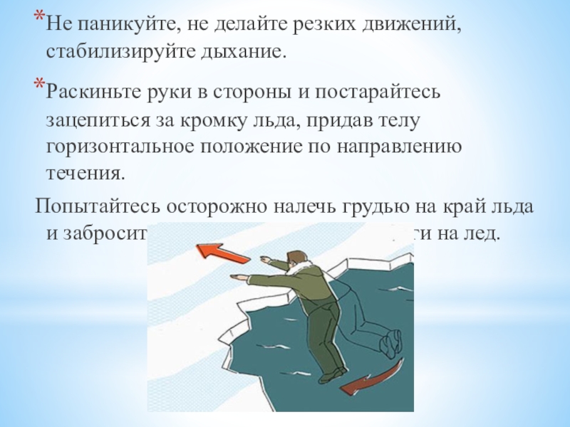 и постарайтесь зацепиться за кромку льда, придав телу горизонтальное положение по направлению течения.