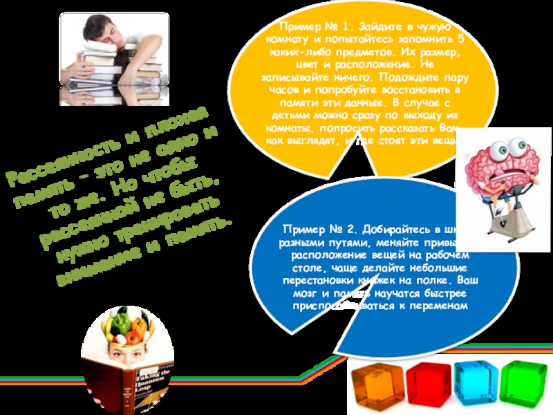 Пример № 2. Добирайтесь в школу разными путями, меняйте привычное расположение вещей на рабочем столе, чаще делайте небольшие перестановки книжек на полке. Ваш мозг и память научатся быстрее приспосабливаться к переменам
