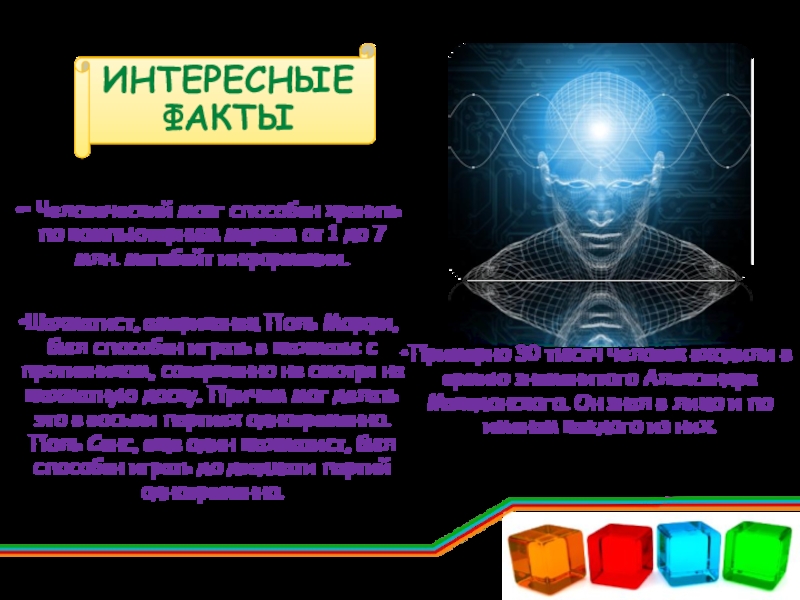 Шахматист, американец Поль Морфи, был способен играть в шахматы с противником, совершенно не смотря на шахматную доску. Причем мог делать это в восьми партиях одновременно. Поль Сенс, еще один шахматист, был способен играть до двадцати партий одновременно.