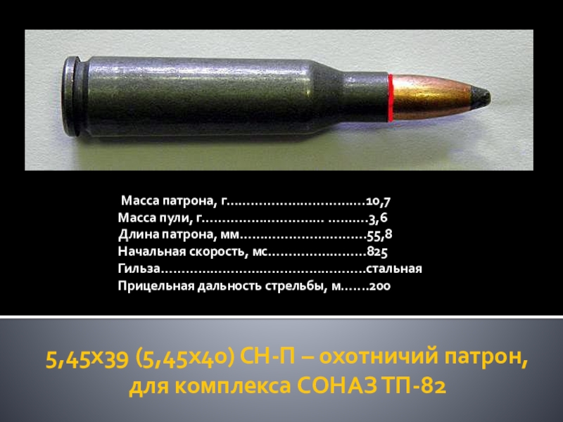 Слайд 245,45х39 (5,45х40) СН-П – охотничий патрон, для комплекса СОНАЗ ТП-82