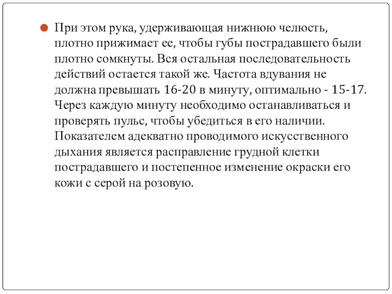 пострадавшего были плотно сомкнуты. Вся остальная последовательность действий остается такой же. Частота вдувания не должна превышать 16-20 в минуту, оптимально - 15-17. Через каждую минуту необходимо останавливаться и проверять пульс, чтобы убедиться в его наличии. Показателем адекватно проводимого искусственного дыхания является расправление грудной клетки пострадавшего и постепенное изменение окраски его кожи с серой на розовую.